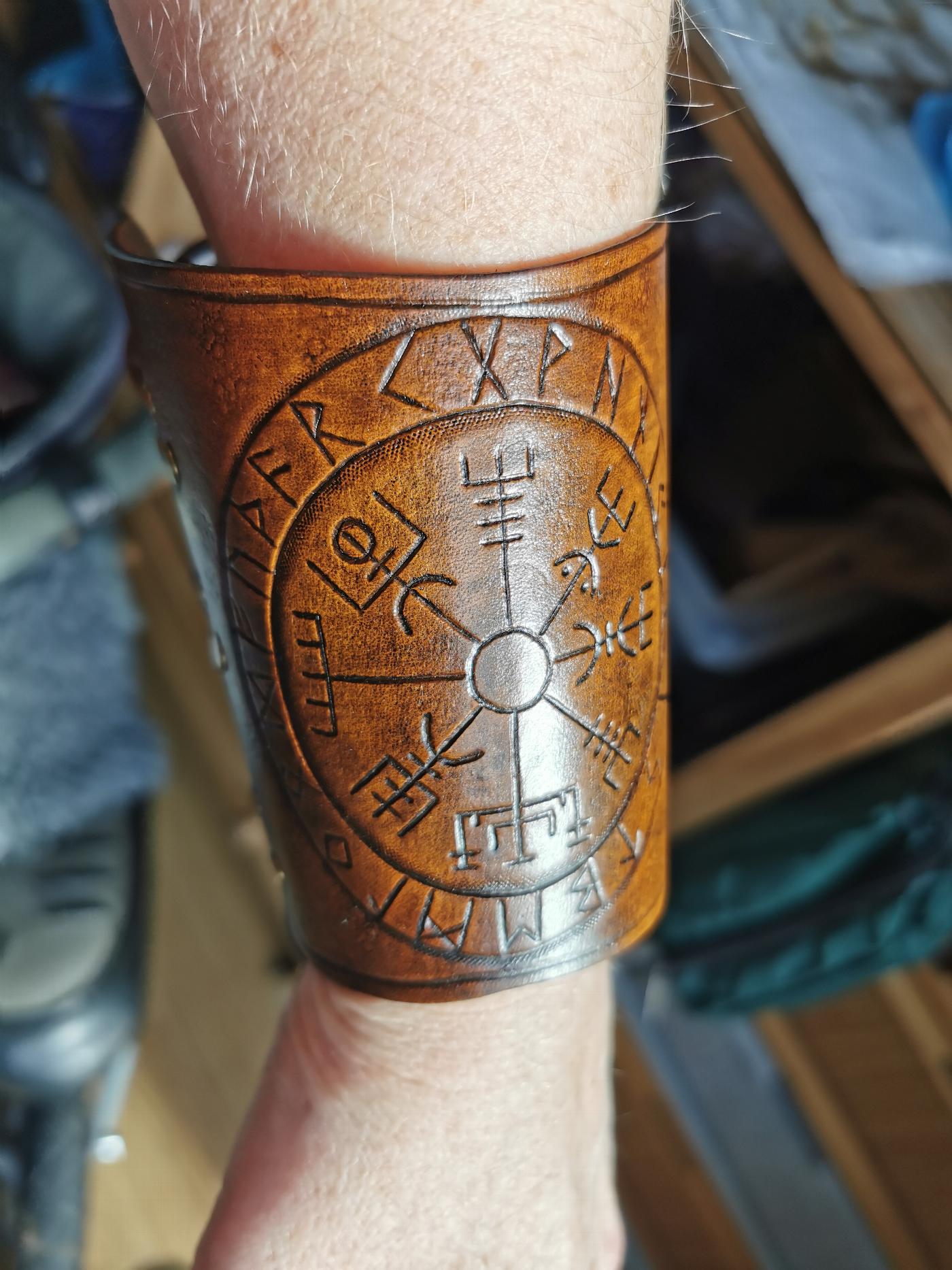 A simple design with the vegvísir (path finder), that looks cool on its own or part of a costume. This is a simple laced cuff but can also have buckles instead.
